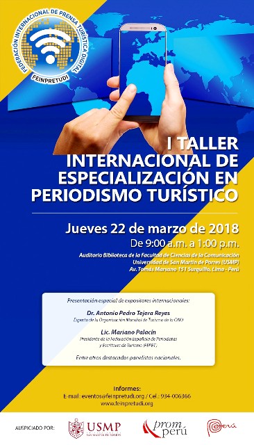 Atendiendo a esta necesidad, la Federación Internacional de Prensa Turística Digital (Feinpretudi) organiza el “I Taller Internacional de Especialización en Periodismo Turístico”, que se realizará el jueves 22 de marzo, de 09:00 a 13:00 hrs, en el Auditorio de la Biblioteca de la Facultad de Ciencias de la Comunicación de la Universidad de San Martín de Porres (USMP), situada en Av. Tomás Marsano 151 Surquillo, Lima.